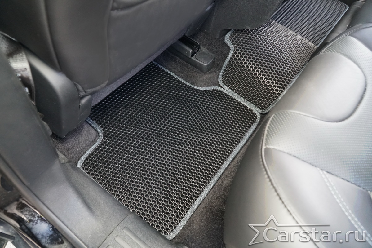 Толщина ковриков EVA составляет 10-12 мм. Глубина ячеек 7-8 мм. Такая толщина ковриков позволяет им служить довольно долго, не протираясь до 3 лет. А благодаря такой глубине ячеек коврик EVA площадью 1 кв.м. способен захватить около 3,5 л жидкости, сохраняя в чистоте вашу обувь и обивку салона.
