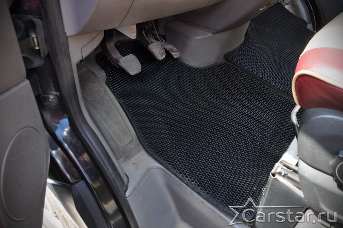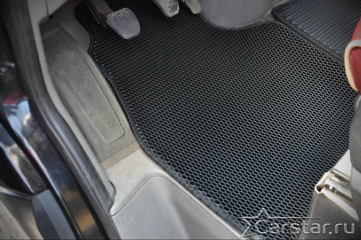 Толщина ковриков EVA составляет 10-12 мм. Глубина ячеек 7-8 мм. Такая толщина ковриков позволяет им служить довольно долго, не протираясь до 3 лет. А благодаря такой глубине ячеек коврик EVA площадью 1 кв.м. способен захватить около 3,5 л жидкости, сохраняя в чистоте вашу обувь и обивку салона.