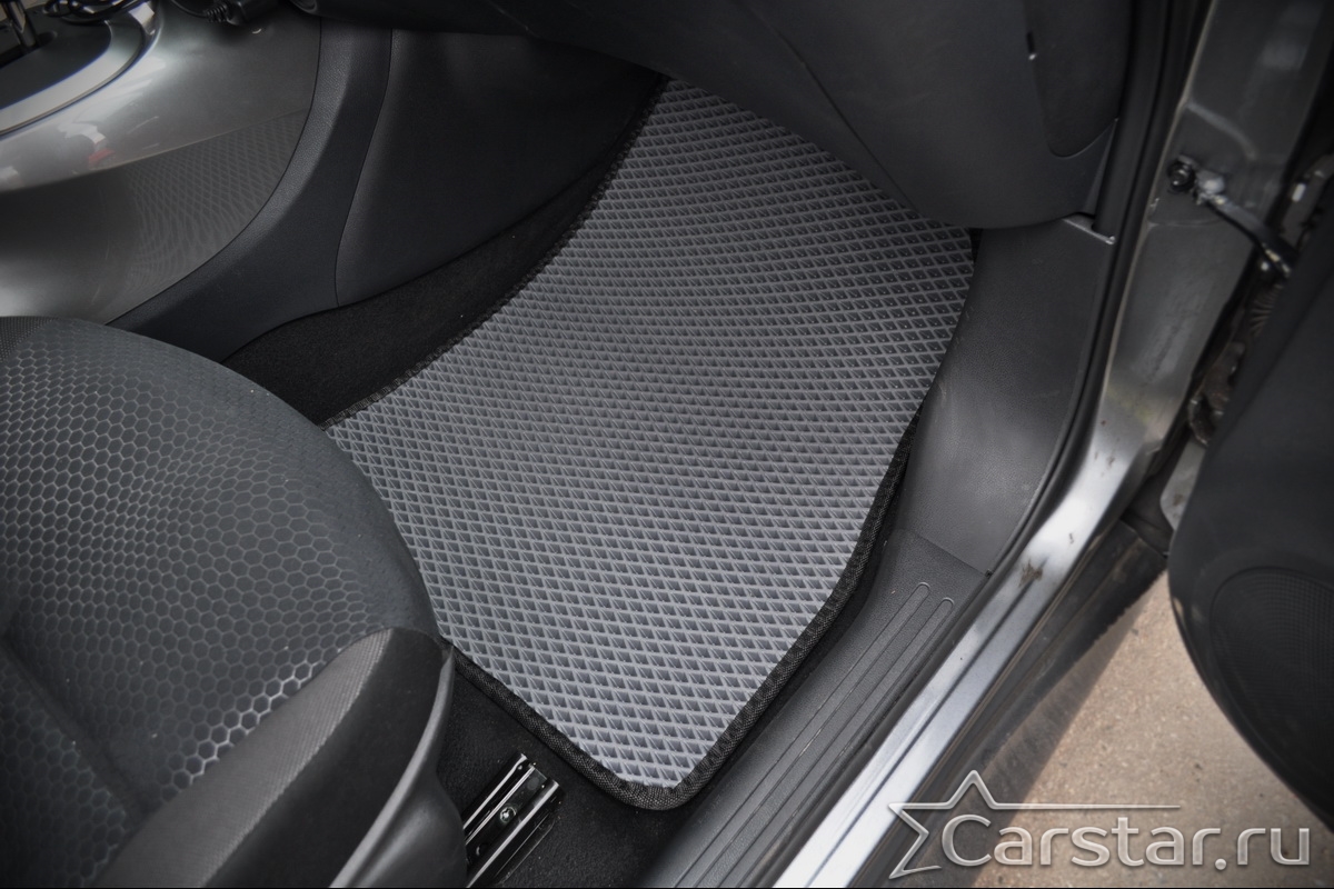 Толщина ковриков EVA составляет 10-12 мм. Глубина ячеек 7-8 мм. Такая толщина ковриков позволяет им служить довольно долго, не протираясь до 3 лет. А благодаря такой глубине ячеек коврик EVA площадью 1 кв.м. способен захватить около 3,5 л жидкости, сохраняя в чистоте вашу обувь и обивку салона.