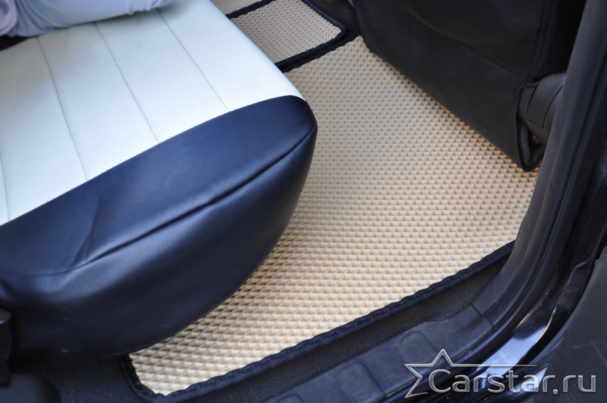Толщина ковриков EVA составляет 10-12 мм. Глубина ячеек 7-8 мм. Такая толщина ковриков позволяет им служить довольно долго, не протираясь до 3 лет. А благодаря такой глубине ячеек коврик EVA площадью 1 кв.м. способен захватить около 3,5 л жидкости, сохраняя в чистоте вашу обувь и обивку салона.