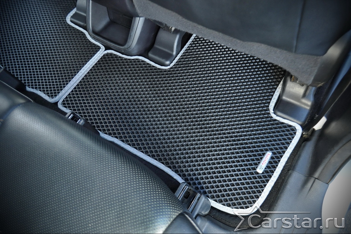Толщина ковриков EVA составляет 10-12 мм. Глубина ячеек 7-8 мм. Такая толщина ковриков позволяет им служить довольно долго, не протираясь до 3 лет. А благодаря такой глубине ячеек коврик EVA площадью 1 кв.м. способен захватить около 3,5 л жидкости, сохраняя в чистоте вашу обувь и обивку салона.