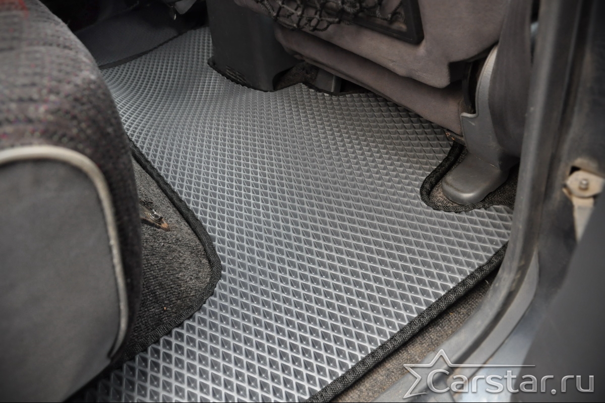 Толщина ковриков EVA составляет 10-12 мм. Глубина ячеек 7-8 мм. Такая толщина ковриков позволяет им служить довольно долго, не протираясь до 3 лет. А благодаря такой глубине ячеек коврик EVA площадью 1 кв.м. способен захватить около 3,5 л жидкости, сохраняя в чистоте вашу обувь и обивку салона.
