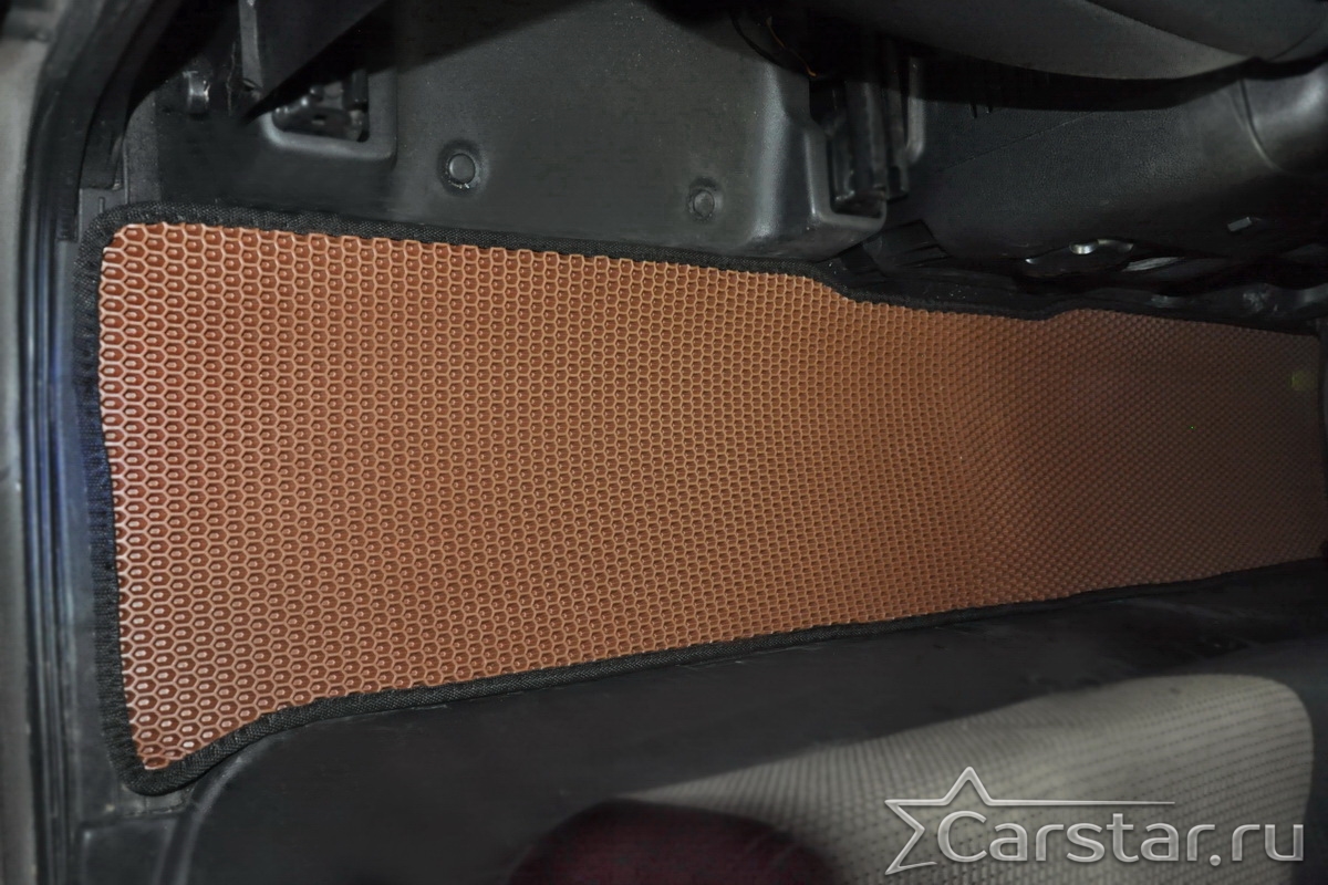 Толщина ковриков EVA составляет 10-12 мм. Глубина ячеек 7-8 мм. Такая толщина ковриков позволяет им служить довольно долго, не протираясь до 3 лет. А благодаря такой глубине ячеек коврик EVA площадью 1 кв.м. способен захватить около 3,5 л жидкости, сохраняя в чистоте вашу обувь и обивку салона.