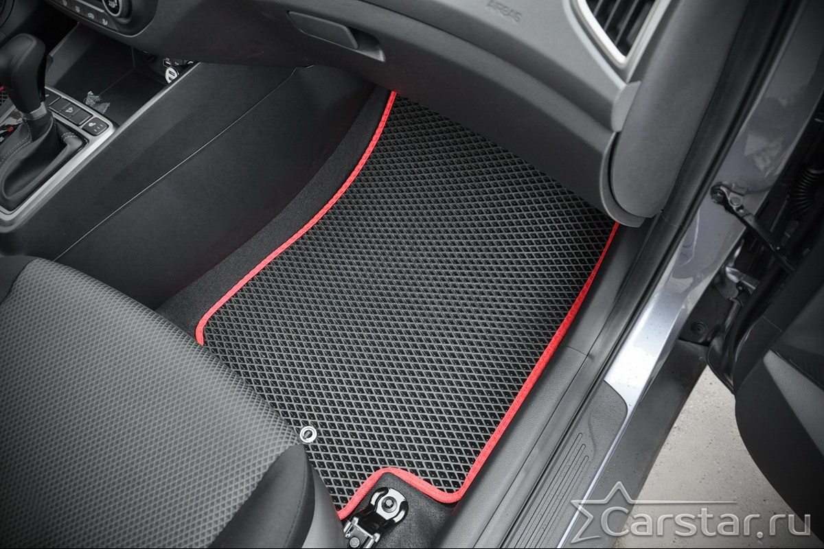 Текстильные коврики надёжно крепятся с помощью оригинальных систем фиксации. Обратная сторона имеет противоскользящее покрытие, что обеспечивает защиту от смещений и безопасность. Максимальное удобство достигается точными лекалами.