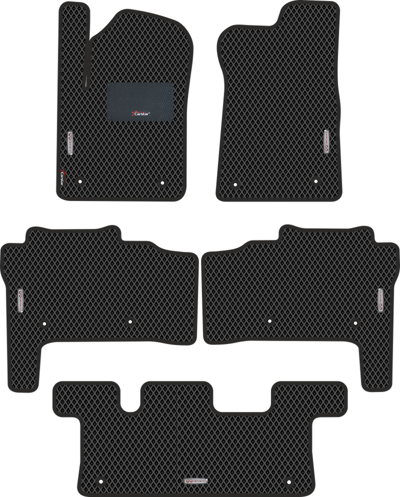 Текстильные автомобильные коврики Infiniti QX56 II 3 ряда (2010-2014) – это классический аксессуар, который обеспечит салону автомобиля неизменную чистоту, порядок и уют. Компания Carstar предлагает изделия из качественного ковролина в сочетании с полипропиленовым основанием на шипах, такая комбинация делает их прочными и водонепроницаемыми.